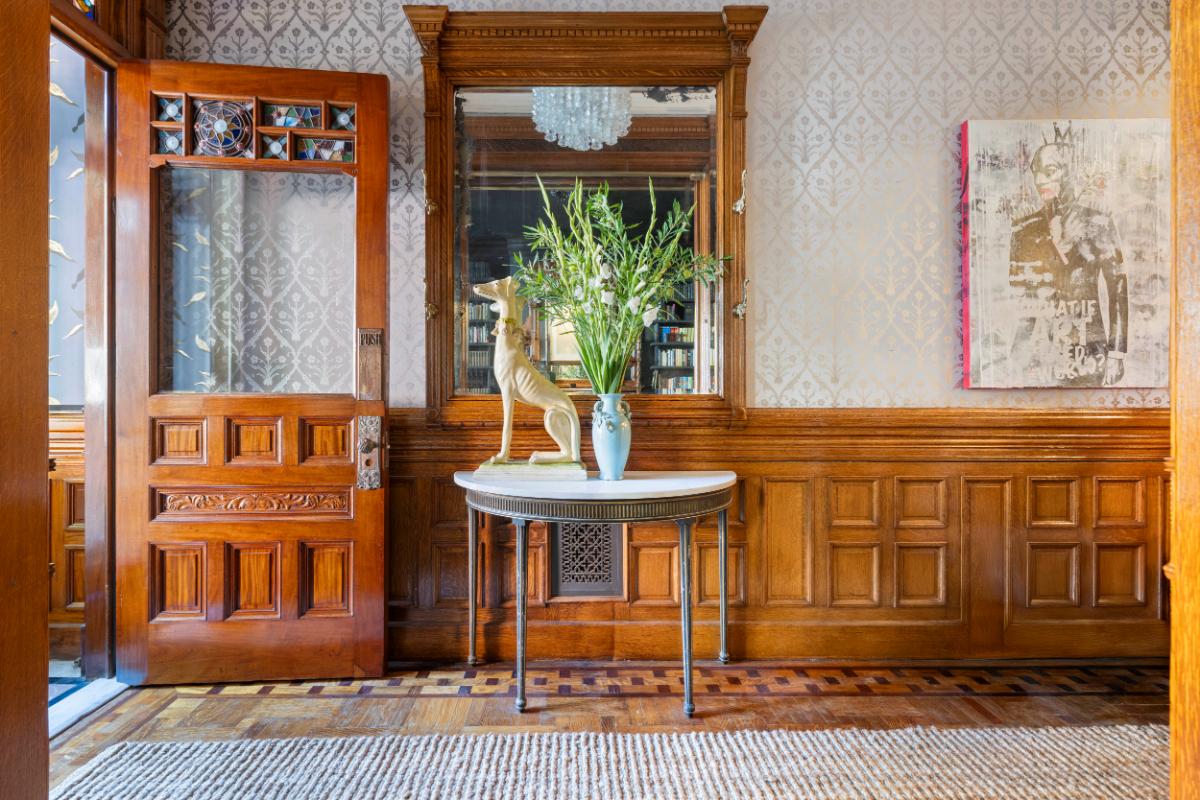 The 6,500-square-foot property offers six bedrooms, six-and-a-half baths and eight fireplaces, most of them operational. Period details, including millwork, carved mantels and a stoop-front façade, remain intact. At the same time, several contemporary upgrades — such as radiant heat on the garden level and solar panels on the roof — bring the historic structure into modern territory.